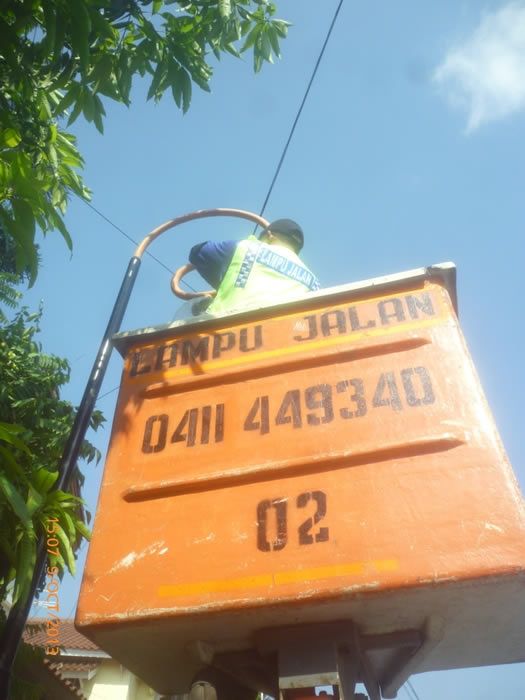 PJU Makassar,- Kegiatan ini dikerjakan menurut laporan pengaduan masyarakat melalui telepon langsung ke Posko Laston dengan Nomor 0411-449340. Laporan juga kami terima lewat e-mail (lastonmercury@gmail.com), lewat media sosial seperti Blog (www.lastonmercury.blogspot.com), Twitter (@PJU_Makassar) ataupun Facebook (PJUKotaMakassar), serta pantauan langsung dari Team Operasional UPTD Penerangan Jalan.